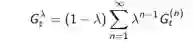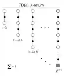 这张图还是比较好理解,例如对于n=3的3-步收获,赋予其在 收获中的权重如左侧阴影部分面积,对于终止状态的T-步收获,T以后的所有阴影部分面积。而所有节段面积之和为1。这种几何级数的设计也考虑了算法实现的计算方便性。