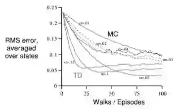 下图比较了MC和TD算法的效率。横坐标是经历的Episode数量,纵坐标是计算得到的状态函数和实际状态函数下各状态价值的均方差。黑色是MC算法在不同step-size下的学习曲线,灰色的曲线使用TD算法。可以看出TD较MC更高效。此图还可以看出当step-size不是非常小的情况下,TD有可能得不到最终的实际价值,将会在某一区间震荡。