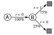 解释:应用MC算法,由于需要完整的Episode,因此仅Episode1可以用来计算A的状态价值,很明显是0;同时B的价值是6/8。应用TD算法时,TD算法试图利用现有的Episode经验构建一个MDP(如下图),由于存在一个Episode使得状态A有后继状态B,因此状态A的价值是通过状态B的价值来计算的,同时经验表明A到B的转移概率是100%,且A状态的即时奖励是0,并且没有衰减,因此A的状态价值等于B的状态价值。