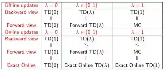 当λ=1时,TD(1)粗略看与每次访问的MC算法等同;在线更新时,状态价值差每一步都会有积累;离线更新时,TD(1)等同于MC算法。
