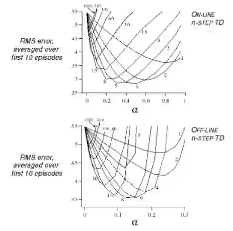 这个示例研究了使用多个不同步数预测联合不同步长(step-size,公式里的系数α)时,分别在在线和离线状态时状态函数均方差的差别。所有研究使用了10个Episode。离线与在线的区别在于,离线是在经历所有10个Episode后进行状态价值更新;而在线则至多经历一个Episode就更新依次状态价值。