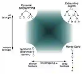 上图从两个维度解释了四种算法的差别,多了一个穷举法。这两个维度分别是:采样深度和广度。当使用单个采样,同时不走完整个Episode就是TD;当使用单个采样但走完整个Episode就是MC;当考虑全部样本可能性,但对每一个样本并不走完整个Episode时,就是DP;当既考虑所有Episode又把Episode从开始到终止遍历完,就变成了穷举法。