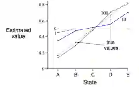 求解:下图是使用TD算法得到的结果。横坐标显示的是状态,纵坐标是各状态的价值估计,一共5条折线,数字表明的是实际经历的Episode数量,true value所指的那根折线反映的是各状态的实际价值。第0次时,各状态的价值被初始化为0.5,经过1次、10次、100次后得到的价值函数越来越接近实际状态价值函数。