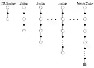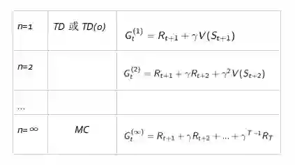 TD或TD(0)是基于1-步预测的,MC则是基于∞-步预测的: