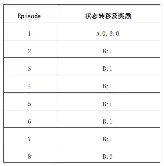 已知:现有两个状态(A和B),MDP未知,衰减系数为1,有如下表所示8个完整Episode的经验及对应的即时奖励,其中除了第1个Episode有状态转移外,其余7个均只有一个状态。