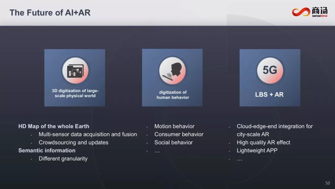 当前苹果、谷歌,都在重兵囤下AR生态开发,高通等基础算力提供方,也认为5G正在加速新计算平台的到来——且认为是AR。商汤也已经布局多年,汤教授说:近年来将AI和AR技术深度融合到产品的研发中,有效扩展了AR应用的想象空间。