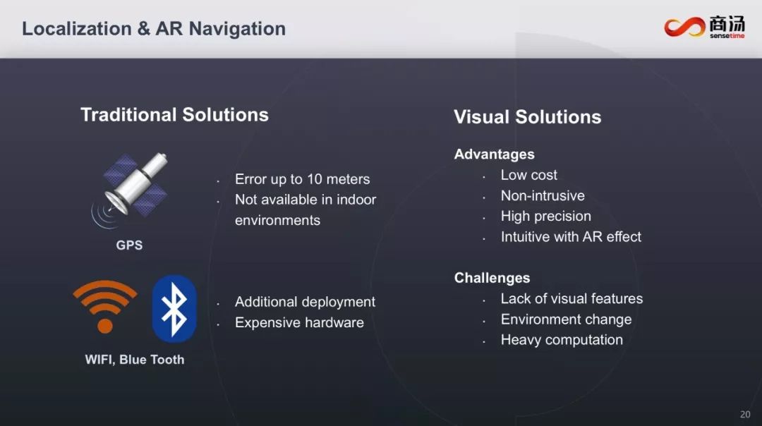 AR导航,这也是AR落地非常难的一个场景。汤教授提到传统的导航方案,比如GPS以及WiFi、蓝牙等虽然普及,但都存在各种各样的缺点,比如误差大于10米、室内无法用(GPS);硬件成本贵、需要附加部署等(WiFi、蓝牙)。