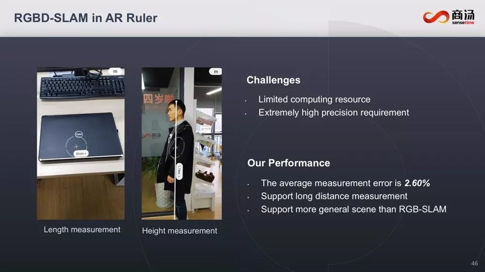 汤教授谈到的最后一个场景,是AR尺子&AR家居。这也是SLAM技术应用落地的重要方向,但这个方向对精度的要求极高。汤教授提到商汤的RGBD-SLAM技术能够在计算资源有限的情况下,支持长距离测量,而且平均测量误差为2.60%。