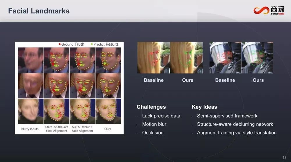 对于这些挑战,汤教授也都介绍了相应的解决思路:可以通过虹膜轮廓特征点和耳朵特征点,来补充特征点。至于缺乏数据以及遮挡、运动模糊等情况,可以用半监督框架、结构感知的去模糊网络等方式来解决。