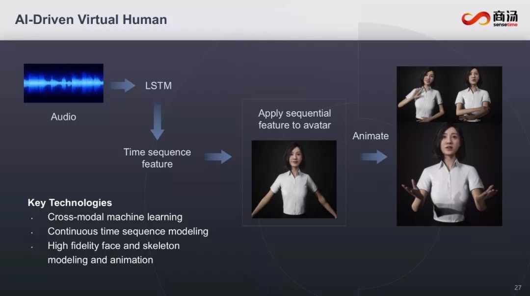 但想要让它变得实用,还有不少挑战,比如音频到3D映射非常困难、如何保持连贯性等等。汤教授同样也给出了相应的思路,采用跨模态机器学习、连续的时间序列建模等方法,能够比较好的解决这些问题。商汤也已经交付了相应的解决方案——SenseAR Avatar。