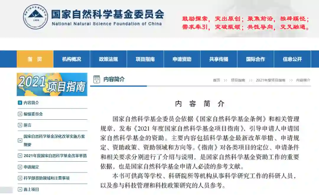 国家自然科学基金委员会依据《国家自然科学基金条例》和相关管理规章,发布《2021年度国家自然科学基金项目指南》,引导申请人申请国家自然科学基金的资助。主要内容包括科学基金最新改革举措、申请规定、资助政策、资助领域和方向等。《指南》对各类项目的定位、申请条件和相关要求分别进行了介绍与说明,是国家自然科学基金资助工作的重要依据,也是国家自然科学基金申请人必读的参考文献。