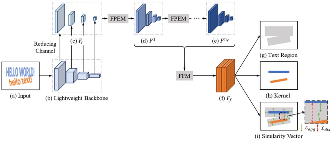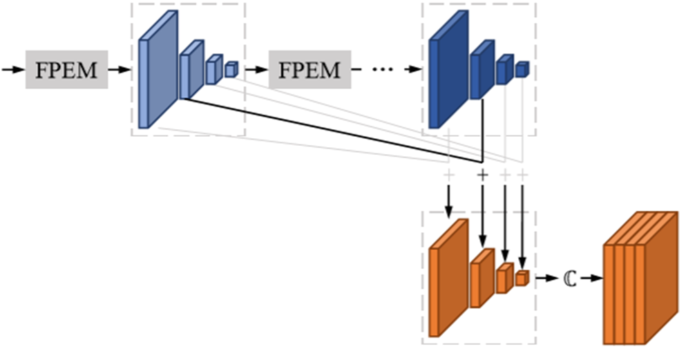 但单纯使用这样一个浅层的主干网络会使得其不具备足够的感受野,而且不能提取到足够强的特征。为了解决这样的问题,PAN在主干网络后添加了一个Segmentation Head去增强特征表达。Segmentation Head包含了特征金字塔增强模块(FPEM)和特征融合模块 (FFM),经过这个结构,PAN预测得到了上述提到的文本区域,核以及相似向量。