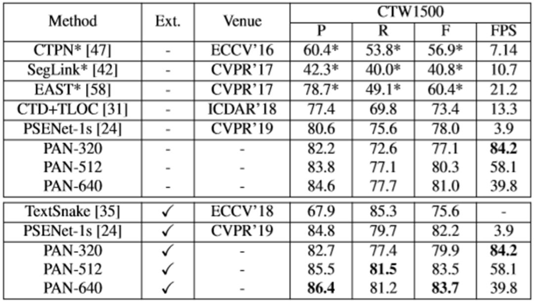 Fig.5展示了不同检测方法在SCUT-CTW1500的检测速度和表现的比较,可以看到PAN是效果最优且速度最快的。