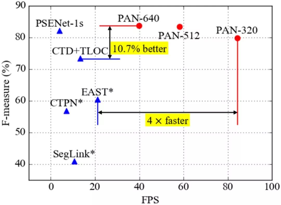 PAN不仅在检测结果上达到了state-of-the-art的效果,而且在速度上比之前的方法都要快很多。