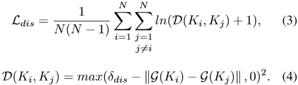此外,聚类中心也需要一直划分清楚,不同文本的核需要保持足够的距离。因此在训练时也用如下损失函数引导训练。