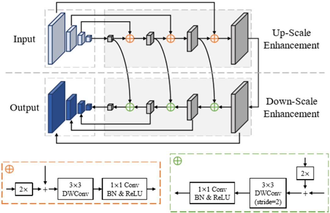 上采样增强作用于输入的特征金字塔,它以32、16、8、4个像素为步长在特征图上迭代增强,而下采样增强则是作用于上一阶段所产生的的特征金字塔并得到FPEM最终的输出,该阶段的增强步长为4-32。