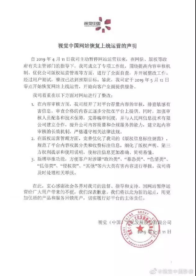 5 月 11 日晚间消息,视觉中国影像发布声明称,经过用户测试,整改已达到预期目标,定于 2019 年 5 月 12 日零点开始恢复网站上线运营,开始向客户全面提供服务。声明中称,自 2019 年 4 月 11 日主动暂停网站运营以来,在网信、版权等政府有关主管部门的指导下,我司成立了专项工作组,围绕提高内容审核机制、优化公司版权运营管理等方面,进行了全面自查,并开展整改工作。经过用户测试,整改已达到预期目标。(新浪科技)
