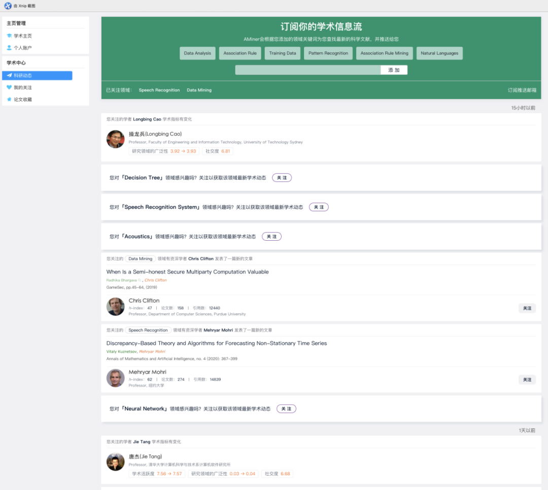 AMiner 是清华大学开发的学术搜索和学术数据挖掘平台。最新推出的订阅功能你只需添加上想追踪的关键词,或者关注你感兴趣的学者大牛,AMiner 就会