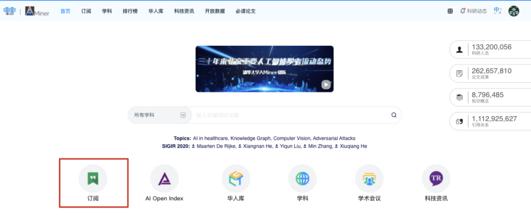 第一步:登录 AMiner 网站完成注册登录,进入「订阅」页面