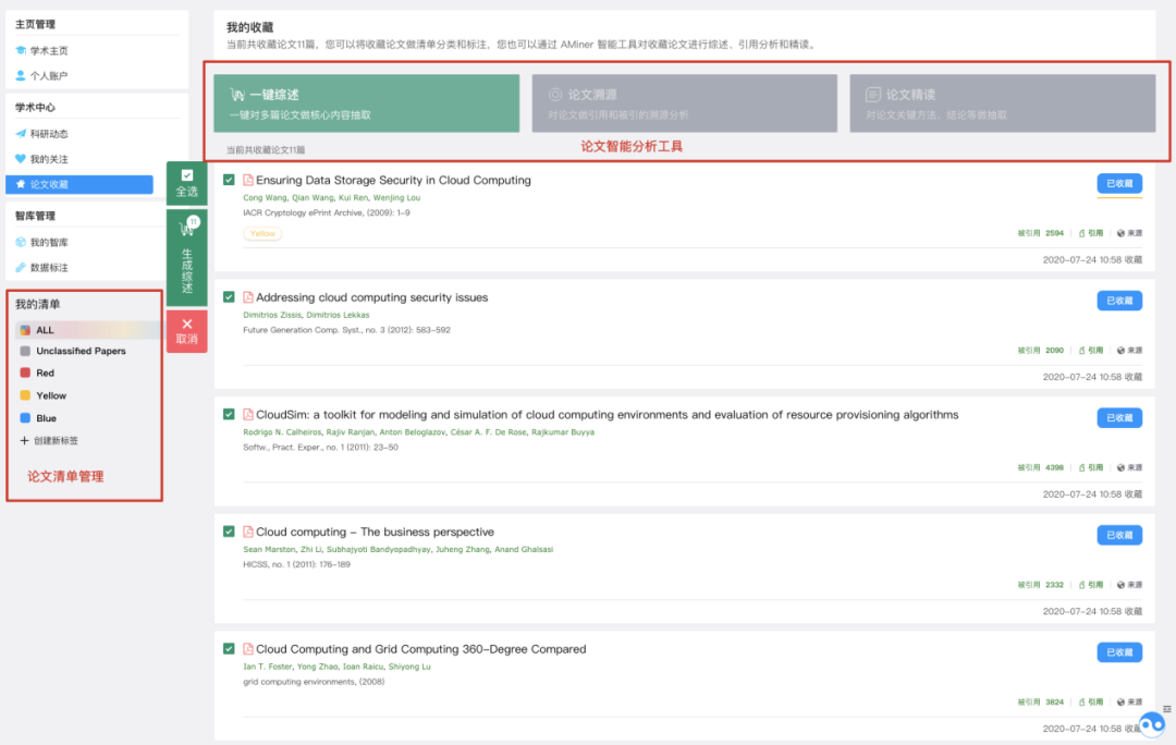 对收藏的论文做清单分类和标注,同时支持对多篇论文的一键综述、一键引用、引用分析和精读。