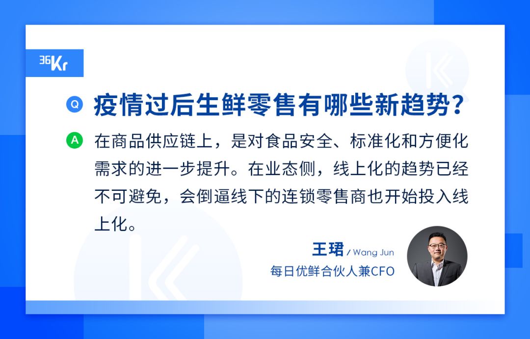 一方面线上生鲜零售被推进到两年后的状态,同时线下份额也开始往龙头商超渗透,生鲜零售行业会出现明显的跑出来第一梯队,有的是以线下龙头的商超加上线上化服务为主的;有的是我们这样纯线上的前置仓连锁企业。