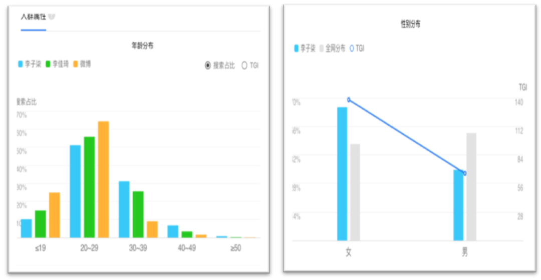 与另一位网络红人李佳琦相比,虽然二人主要年龄分布一致(与全网网民上网的年龄分布一致),但存在细微的差别。