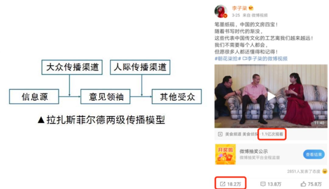 意见领袖:从大众传媒中获取信息的意见领袖KOL,再将信息传播到普通民众(二级传播转发量为18.2万次)。