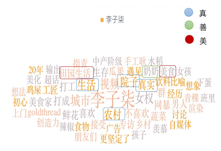 从以下关联词云可以看出李子柒的作品所引发的情感可以概括为“真善美”,“农村、生活、真实、院子”可以看出情感内涵是真,“奶奶”的情感内涵是善,“田园生活、美食”的情感内涵是美。