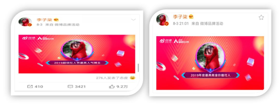 李子柒在红人节中分别获得了2019超级红人节最具人气博主,以及2019年度最具商业价值红人的头衔。