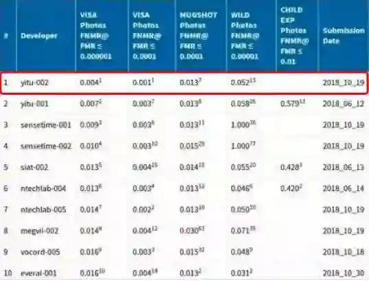 FRVT官网最新Leaderboard:左起第三列开始,数字右上角的角标代表算法在特定阈值下单项测试集的排名,可以看出 yitu-002 在 Visa 和 Mugshot 两个场景中性能优异,因此综合排名第一。