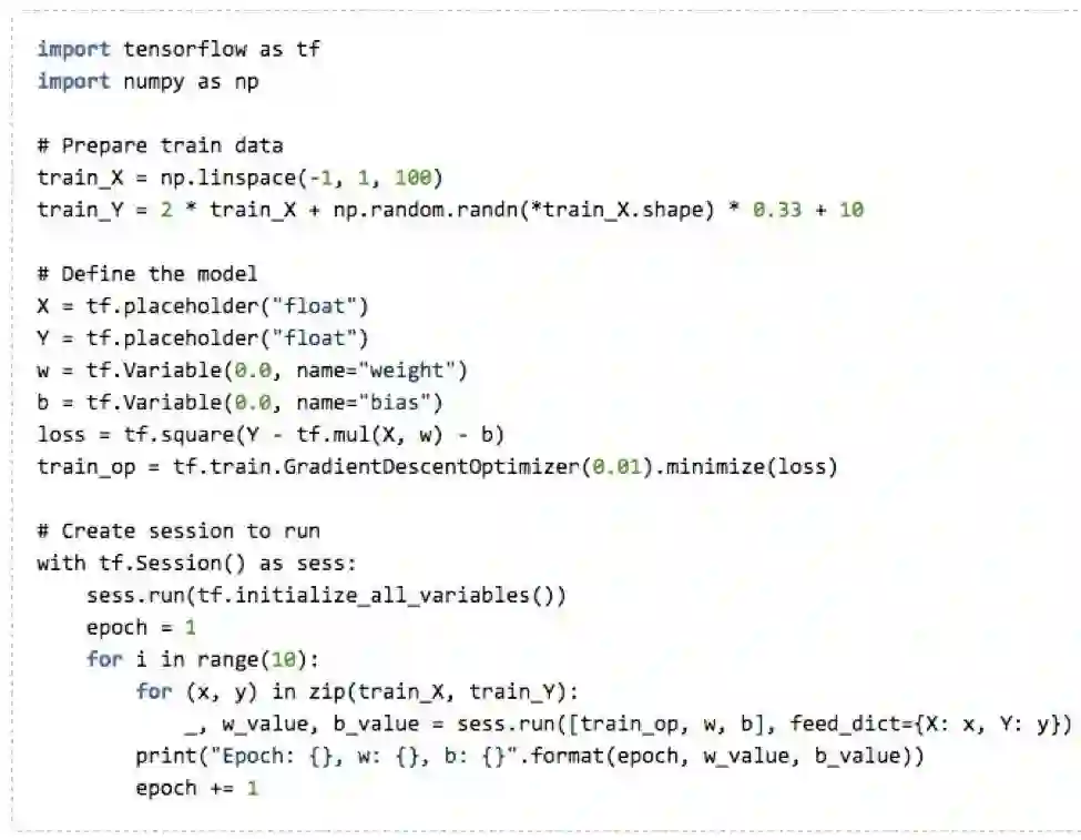为了快速的熟悉TensorFlow编程,下面从一段简单的代码开始: