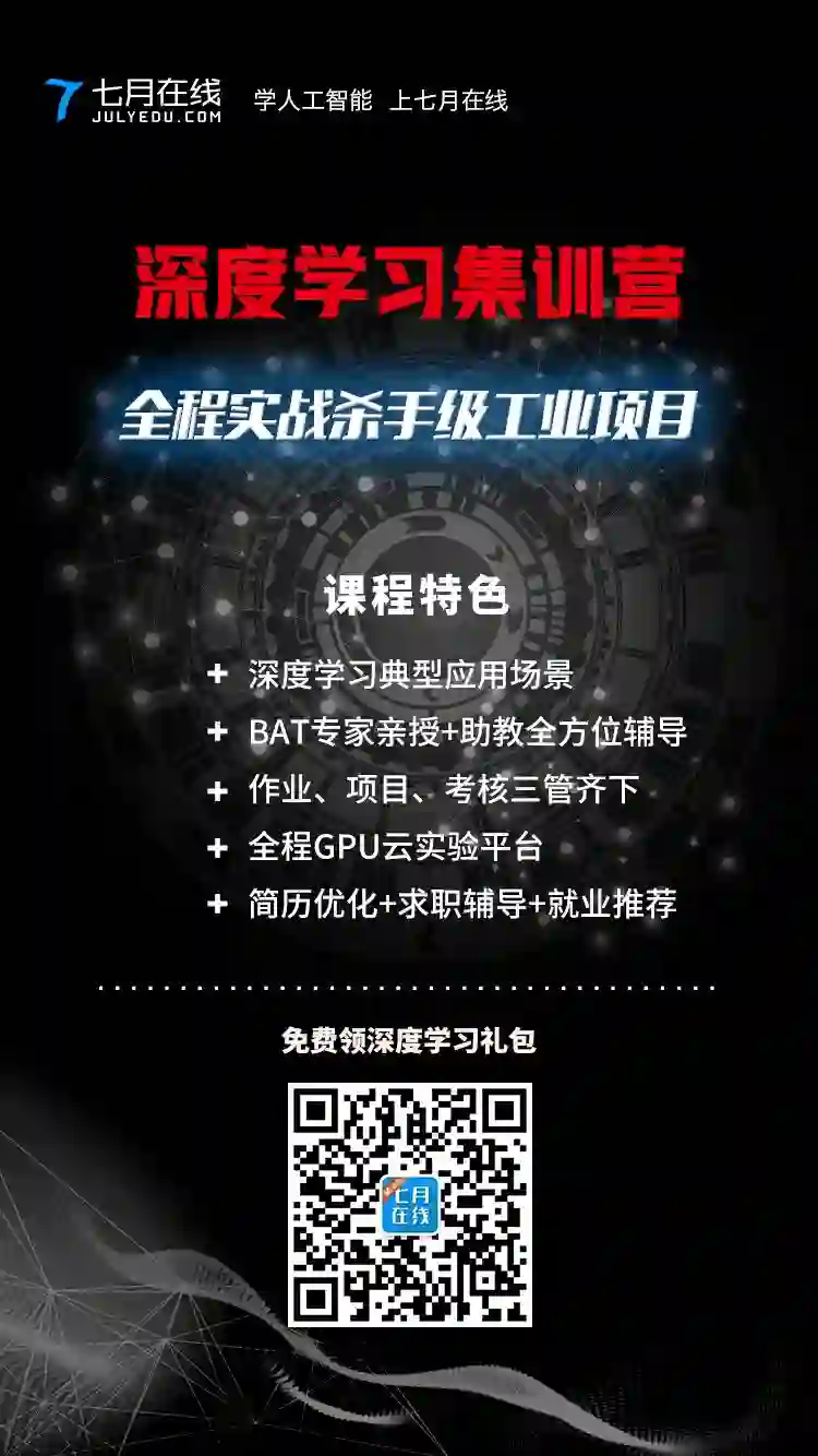 TensorFlow是很好的深度学习框架,希望在深度学习方向有更深入的学习和实践的同学,七月在线特此推出《深度学习集训营》课程,略过Python基础,从TensorFlow搭建DNN解决问题起步,实战BAT工业项目。