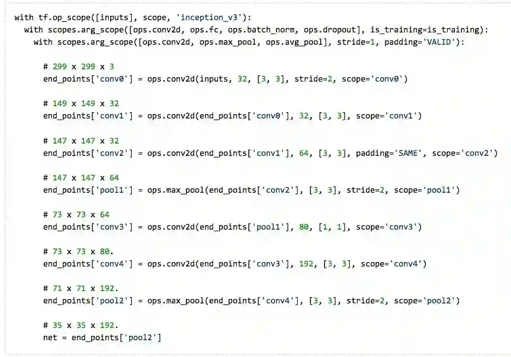 前面的模型只有w和b两个变量,如果数据处于非线性关系就难以得到很好的结果,因此我们建议使用深层神经网络,这也是TensorFlow设计重点就要解决的深度学习模型。Google在2014年凭借Inception模型赢下了ImageNet全球竞赛,里面代码就是基于TensorFlow实现的,下面是较为复杂的模型定义代码。