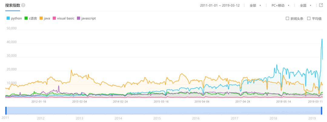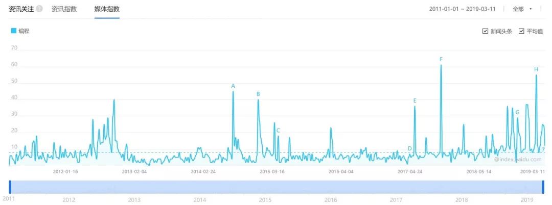 在百度指数中以“编程”为关键词进行分析,早在2012年,“编程”的媒体指数就经历过一次高峰,之后多次登上新闻头条。进入2018年,媒体指数又迎来高潮。正如郭炜所说:“现在所有人都要学编程。”
