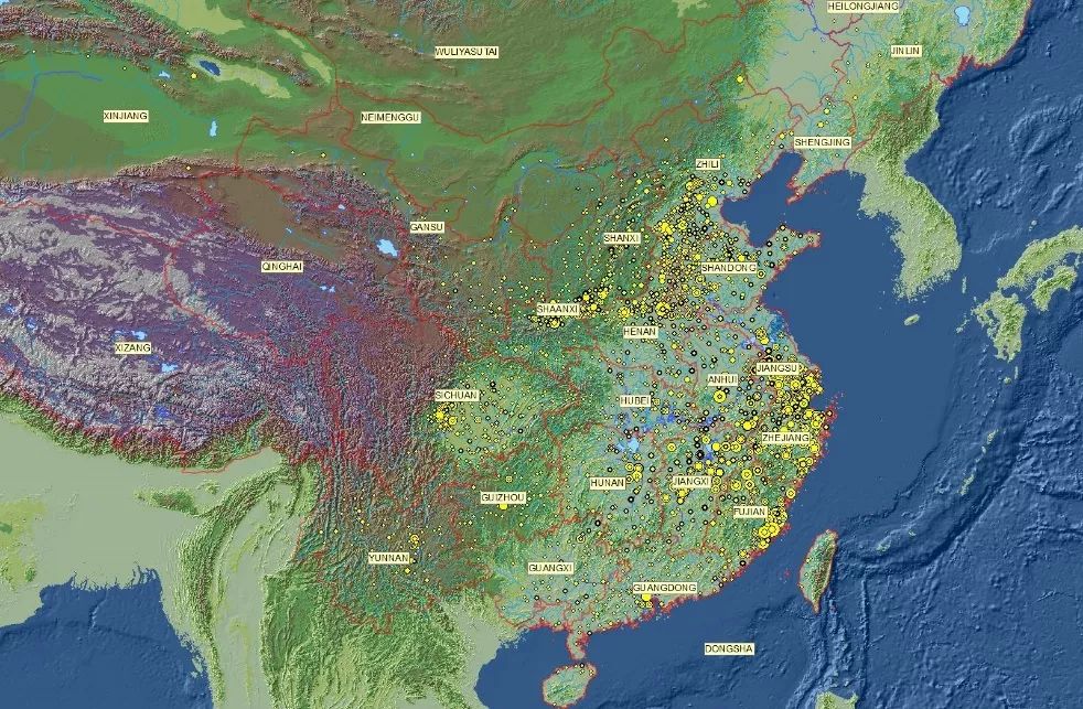 CBDB 中已知籍贯的 67,000 历史人物的地理分布图