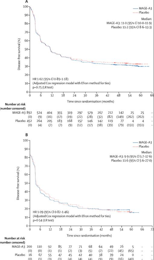 截止最后一次无病生存期分析时(2013年5月23日),共有856名病人发生病情的复发或死亡,其中MAGE-A3组572人(64%),安慰剂组284人(63%),两组的平均随访时间分别为28个月和28.1个月,平均无病生存期分别为11个月和11.2个月。