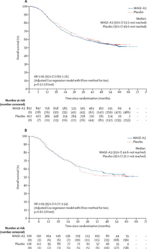 无论是在GS阳性还是在GS阴性的病人群体中,MAGE-A3治疗组和安慰剂组在无病生存期、总体生存期、疾病特异性生存期还是无远距离转移生存期方面都没有显著性差异。