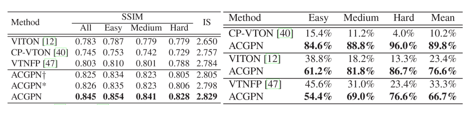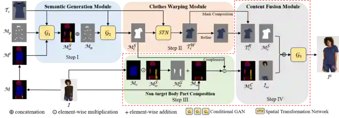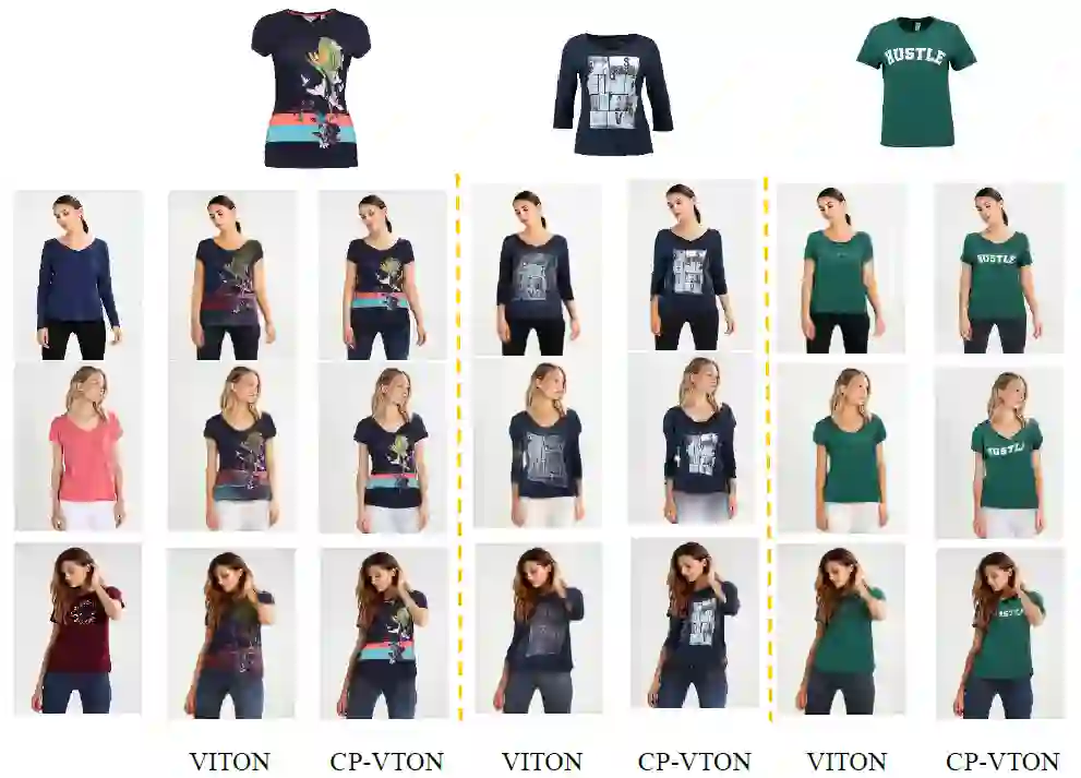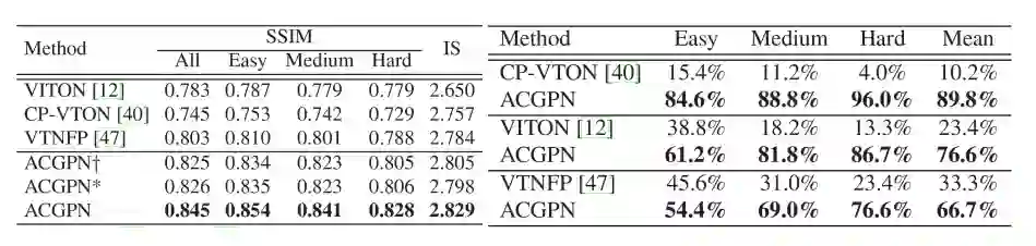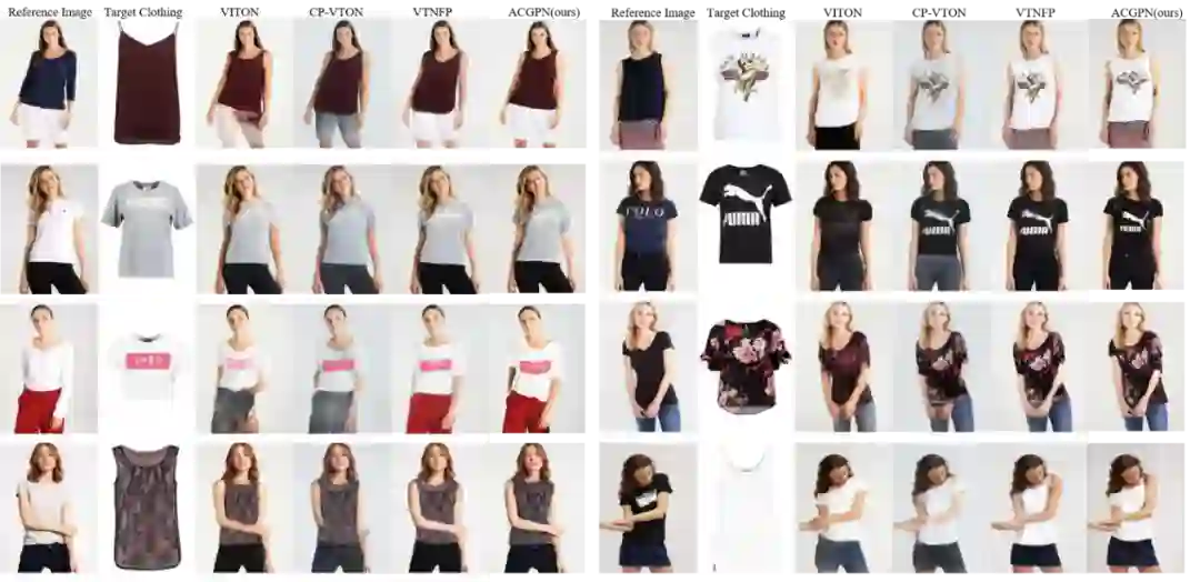 该文章提出了一种自适应内容生成保留网络即 ACGPN。此方法利用一种 layout aware 的方法,自适应的判断哪部分图像是应该保留的,解决了现有方法中,无法对人物肢体与衣服有遮挡的情况的建模,极大程度地降低了生成结果中的伪影以及模糊细节;并通过引入仿射变换的共线性等性质,对变形 inshop-clothes 中的 TPS 变换起到约束,使得 Logo 和花纹不易扭曲变形。