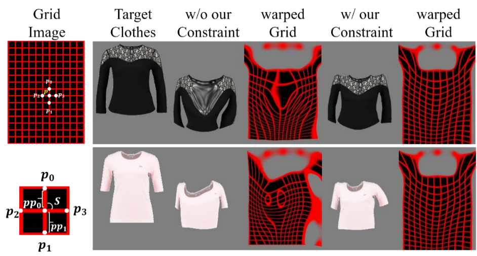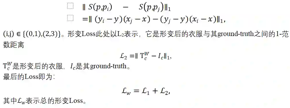 第二部分是衣服变形模块(Clothes Warping Module (CWM)),该模块用于根据生成的语义布局对衣服进行变形操作。除了基于薄板样条的方法以外,还对变形优化目标引入了二阶差分约束,以使变形过程更加稳定,尤其是对于质地复杂的衣服。