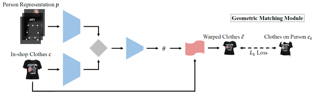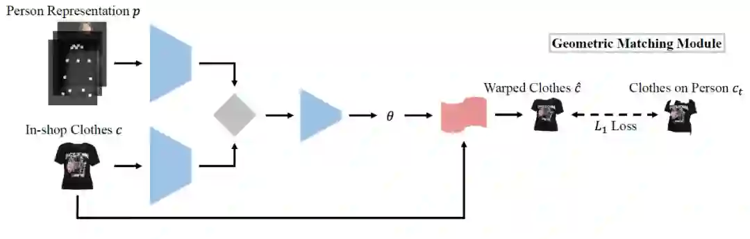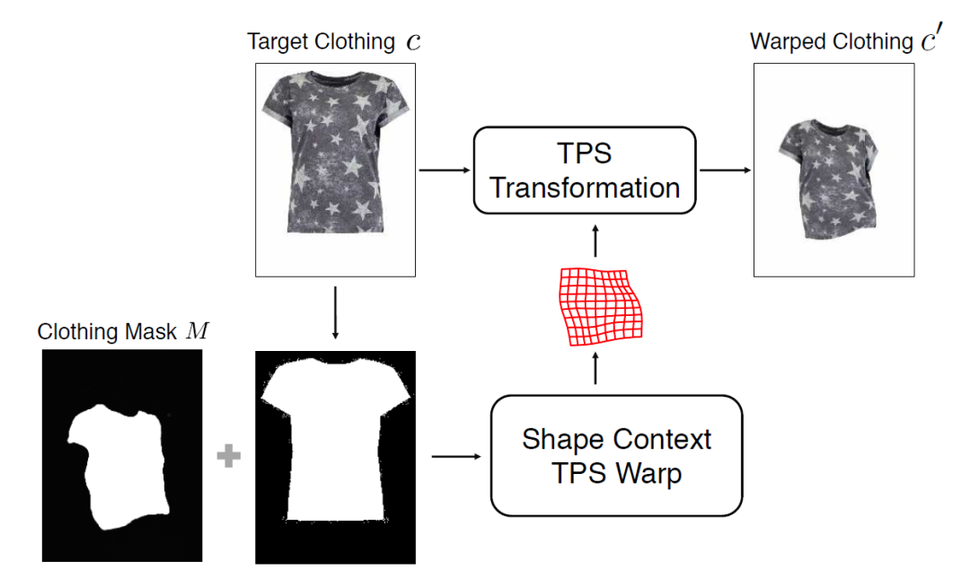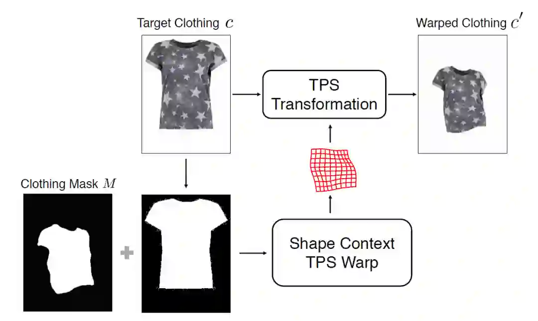 VITON:如图所示,VITON 通过先生成衣服 mask 和原始 inshop-clothes 的 mask 来计算 TPS 变换的参数,将这套参数使用到 inshop-clothes 上,生成一个变形衣服图。之后会和之前生成的一个 coarse 人物结果,一起 refine 出最终结果。整个流程是 2-stage 模式。VITON 在进行图像对齐的时候,利用 Shape Context 描述子提取图像特征完成对齐,后来的 CP-VTON 则把这个部分用卷积神经网络代替。