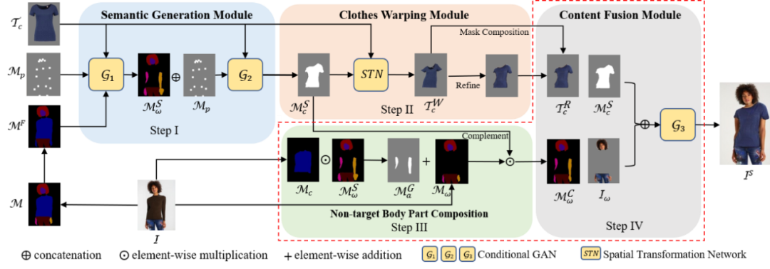 第一个是语义生成模块(Semantic Generation Module (SGM)),它使用身体部位和衣服的语义分割来逐步生成暴露的身体部位的蒙版(即,合成的身体部位蒙版)和变形衣服区域的蒙版。与现有技术相反,提出的 SGM 以两阶段的方式生成语义蒙版,以首先生成身体部位并逐步合成服装蒙版,这使得参考图像中的原始服装形状对于网络完全不可知。