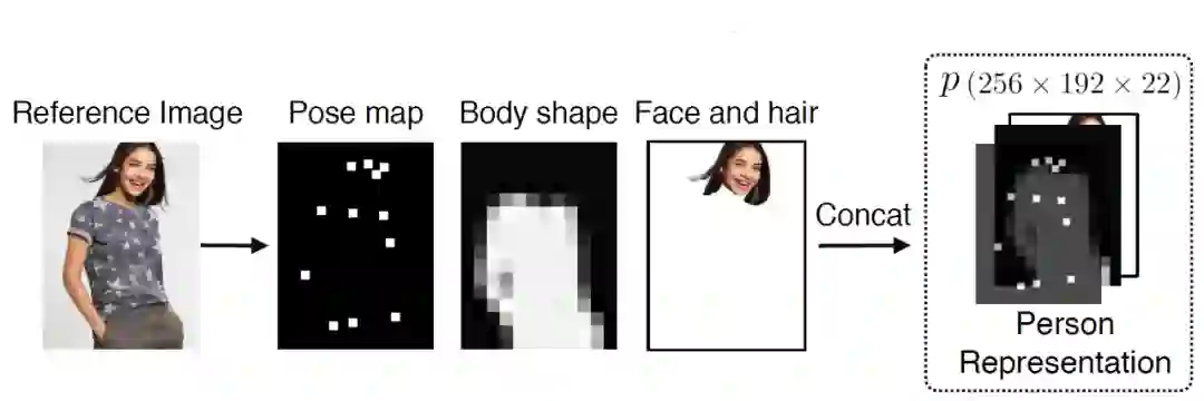 由于同一个模特在同一姿势下穿着不同衣服的数据集较难获得,常见做法是,将人物图片的监督信息减弱,再将与人物身上同样的 inshop-clothes(平铺的衣服正面大图)穿在这个处理过后的表达上。将图片的监督信息减弱防止过强的参考使得网络无法泛化到不同的衣服上。也就是提取关键点,模糊形状等来作为一个人物的表达,再重构原来的图像。经典的衣服无关人物表达(clothing-agnostic person representation) 如下图所示。