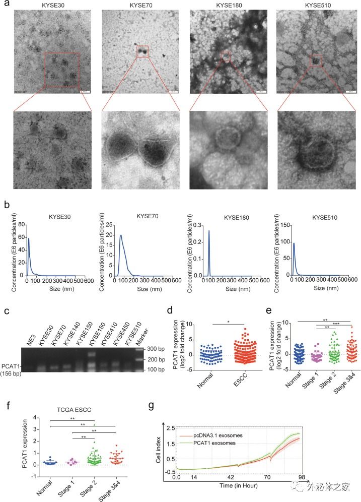 图:PCAT1存在于ESCC细胞分泌外泌体中,并且在患者血清中高表达