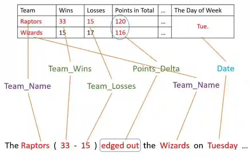 这篇论文(Nie et al., 2018)是微软亚洲研究院知识计算组对改进神经模型生成文本正确性的一个尝试。在前文中我们也提过,很多时候训练数据中,文本和结构化数据无法一一对齐,这对结构化数据到文本生成提出很大的挑战。例如句子 “Hawks edges the Heat with 95-94”,其中队名Hawks、Heat和比分95、94均可以直接从输入数据中获取,而描述比赛结果的edges (“险胜”)是基于两队比分极其接近的事实而得出,现实中的结构化数据往往不会直接包含此类细粒度事实。进一步调研发现,在本论文收集的ESPN dataset数据集、前文所述RotoWire数据集以及维基百科人物数据集WikiBio的文本中,分别有29.1%、11.7%和7.4%的事实虽然不能从输入数据中直接获取,但可以通过对输入数据进行运算而获得。基于这些观察,论文提出了基于运算指引的神经文本生成模型。具体来说,该模型预先执行好若干种预定义的运算操作,在进行文本生成时,解码器从输入数据和运行结果中利用门限(gating)机制动态采用所使用的信息来源。另外,为了缓解数值数据的稀疏性问题,文中还将运算结果中的数值进行自动分段处理,使得模型更容易建立运算结果同词汇选择的联系。