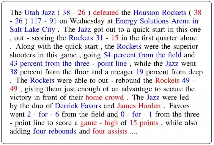 由Sasha Rush领衔的哈佛大学自然语言处理研究组是近年来研究神经网络文本生成模型最活跃的团队之一。该团队在EMNLP 2017上发表了题为Challenges in Data-to-document Generation的工作(Wiseman et al., 2017),包含了作者对神经网络数据到文本生成模型的阶段性总结与反思。作者采集了大量NBA篮球比赛统计数据以及对应的文字战报,以此发布了新的数据集RotoWire。与《如何让人工智能学会用数据说话》一文中介绍过的维基百科传记数据集WikiBio以及下文会提及的E2E NLG Challenge评测数据集相比,RotoWire中的输入数据更丰富,文本长度更长,通常每篇描述包含5-7句话;并且文字中直接提及或通过不同措辞蕴含的部分信息,需要从具体的数值、时间等信息推断得出,无法从输入的表格数据中直接获取。例如,输入数据中并没有直接标示比赛的获胜球队,只列出了交战双方比分,而文字内诸如“亚特兰大老鹰队以103-95击败迈阿密热队”中的“击败”一词,需要生成模型能够准确捕捉“比分更高的球队胜出”这样的对应关系,对当前高度依赖连续向量表示的神经网络方法而言颇具挑战。