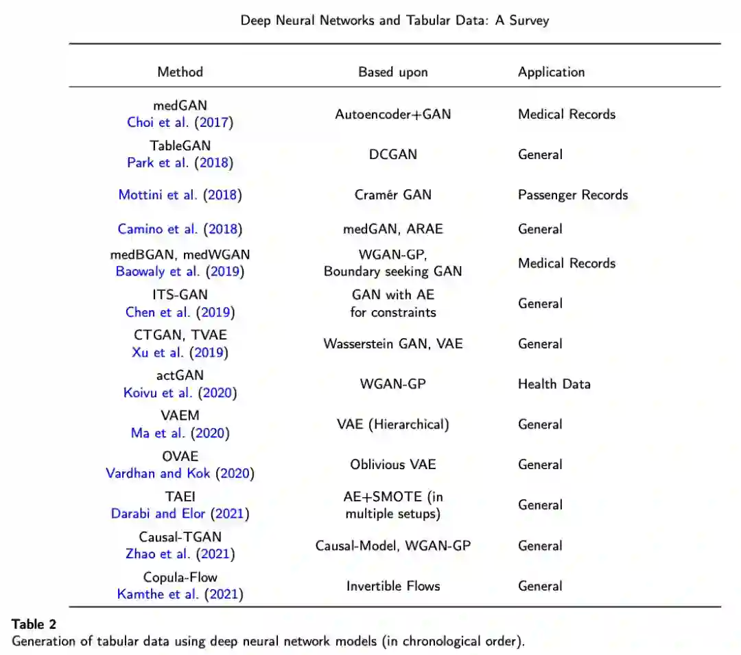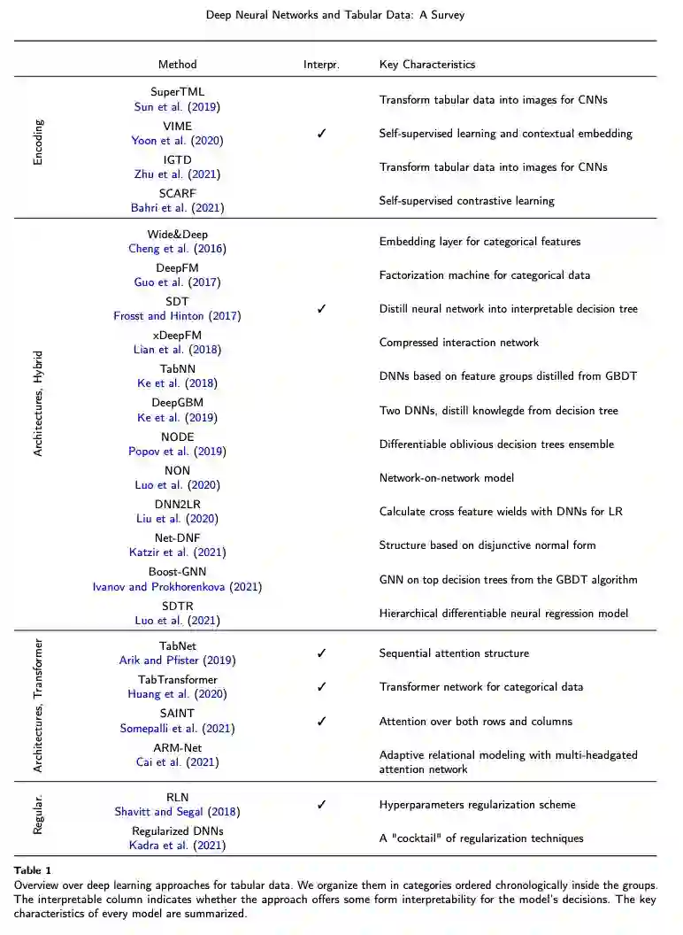论文地址:https://www.zhuanzhi.ai/paper/875f1b7297b82357dd1057e2045cf645 通过解释表格数据上的深度学习模型,该研究对生成表格数据的深度学习方法展开了详细的讨论。主要贡献包括对领域内的主要研究流派和现有方法进行分类,同时突出相关挑战和开放型研究问题。这是领域内首个深入研究基于表格数据的深度学习方法的工作,可作为表格数据深度学习研究者和从业者的宝贵指南。 深度神经网络的成功是借助大量计算和存储资源和可用的大型标记数据集(Schmidhuber,2015;Goodfellow et al.,2016),特别是基于卷积、循环深度学习机制(Hochreiter and Schmidhuber,1997)或 transformer 网络(Vaswani 等,2017)。 尽管深度学习方法在同类数据(例如图像、音频和文本数据)上的分类或数据生成任务上均表现出色,但表格数据仍然对这些模型构成挑战(Arik and Pfister,2019;Popov et al.,2019); Shwartz-Ziv and Armon,2021)。Kadra 等(2021)将表格数据集命名为深度神经网络模型最后一个「未征服的城堡(unconquered castle)」。 与图像或语言数据相比,表格数据是异构的,导致其具有密集的数值特征和稀疏的分类特征。此外,这些特征之间的相关性也比图像或语音数据中的空间或语义关系弱。变量可以相关也可以独立,特征也没有位置信息。因此,在不依赖空间信息的情况下发现和利用相关性(Somepalli et al.,2021)是很有必要的。 异构数据是最常用的数据形式(Shwartz-Ziv and Armon,2021),它在许多关键应用中无处不在,例如基于患者病史的医学诊断(Ulmer et al.,2020;Somani et al.,2021;Borisov et al.,2021),金融应用的预测分析(Clements et al.,2020)、点击率 (CTR) ) 预测(Guo et al.,2017)、用户推荐系统(Zhang et al.,2019)、客户流失预测(Ahmed et al.,2017;Tang et al.,2020)、网络安全(Buczak and Guven,2015) 、欺诈检测(Cartella et al.,2021)、身份保护(Liu et al.,2021a)、心理学(Urban and Gates,2021)、延迟估计(Shoman et al.,2020)、异常检测(Pang et al.,2021)等等。在所有这些应用程序中,预测性能和稳健性的提升可能对最终用户和提供此类解决方案的公司都有相当大的好处。但其中需要处理许多与数据相关的陷阱,例如噪音、不精确、不同的属性类型和值范围,或者值的不可用。 同时,深度神经网络与传统机器学习方法相比具有多种优势。它们非常灵活(Sahoo et al.,2017),并允许进行高效的迭代训练。深度神经网络对 AutoML 尤其有价值(He et al.,2021;Artzi et al.,2021;Shi et al.,2021;Fakoor et al.,2020;Gijsbers et al.,2019;Yin et al.,2020)。使用深度神经网络可以生成表格数据,例如,可以帮助缓解类不平衡问题(Wang et al.,2019c)。最后,神经网络可以用于多模态学习问题,其中表格数据可以是许多输入模态之一(Baltrušaitis et al.,2018;Lichtenwalter et al.,2021;Shi et al.,2021;Pölsterl et al.,2021;Soares et al.,2021),用于表格数据蒸馏(Medvedev and D'yakonov,2020;Li et al.,2020a),用于联邦学习(Roschewitz et al.,2021)以及更多场景。 由于数据收集步骤,特别是对于异构数据,成本高昂且耗时,因此有多种方法可以生成合成表格数据。然而,对表格数据中行的概率分布进行建模并生成真实的合成数据具有挑战性,因为异构表格数据通常包括离散和连续变量的混合。连续变量可能有多种模式,而离散列通常是不平衡的。所有这些缺陷与缺失值、噪声值或无界值相结合,使得表格数据生成问题变得相当复杂,即使对于现代深度生成架构也是如此。第 5 章讨论了 SOTA 表格数据生成方法。 另一个重要方面是对表格数据的深度神经网络的解释(Grisci et al.,2021)。许多用于解释深度神经网络的流行方法源于计算机视觉领域,其中突出显示像素组,创建所谓的显著图。尽管如此,对于表格数据集,突出显示变量关系也是必不可少的。许多现有方法,尤其是那些基于注意力机制的方法 (Vaswani et al., 2017),是通过设计突出显示关系,并且它们的注意力图可以很容易地可视化。 基于本研究,数据科学从业者和研究人员将能够快速为用例或研究问题确定起点和指导。
