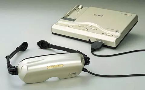 其实这并不是奥林巴斯第一次推眼镜类产品,早在 2000 年,它就推出过 EyeTrek FMD(Face-Mounted Display)系列产品。不过这款设备更类似于「头戴影院」,而非人们现在了解的智能眼镜类产品。当年的 FMD 系列产品定价高达 400 美元(抛开通胀要比现在 iPhone X 更贵),还要配一个复读机大小的分体设备。美国媒体 CNET 毫不犹豫的给了这款设备差评,并在评测中 diss道:「如果你兜里实在有 400 美元没处花,还不怕眼睛疼,就买这玩意儿吧。」