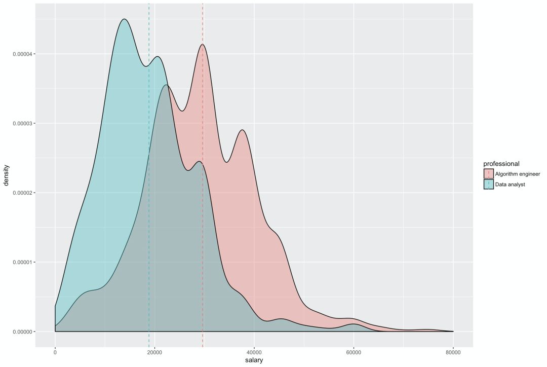 我们首先来看下数据分析师与算法工程师的薪资水平密度分布图,绘制出这两个岗位的薪资分布密度图并标记出薪资的均值(图中虚线)👇