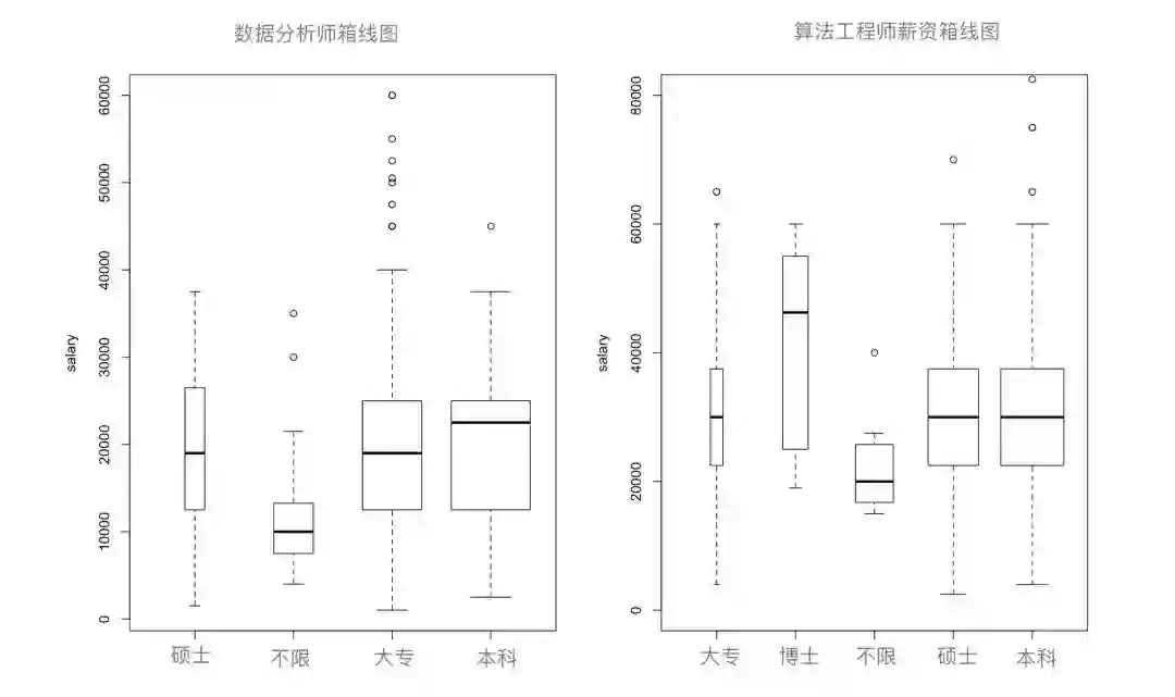 在本节,我们使用箱线图来分析学历对薪资的影响: