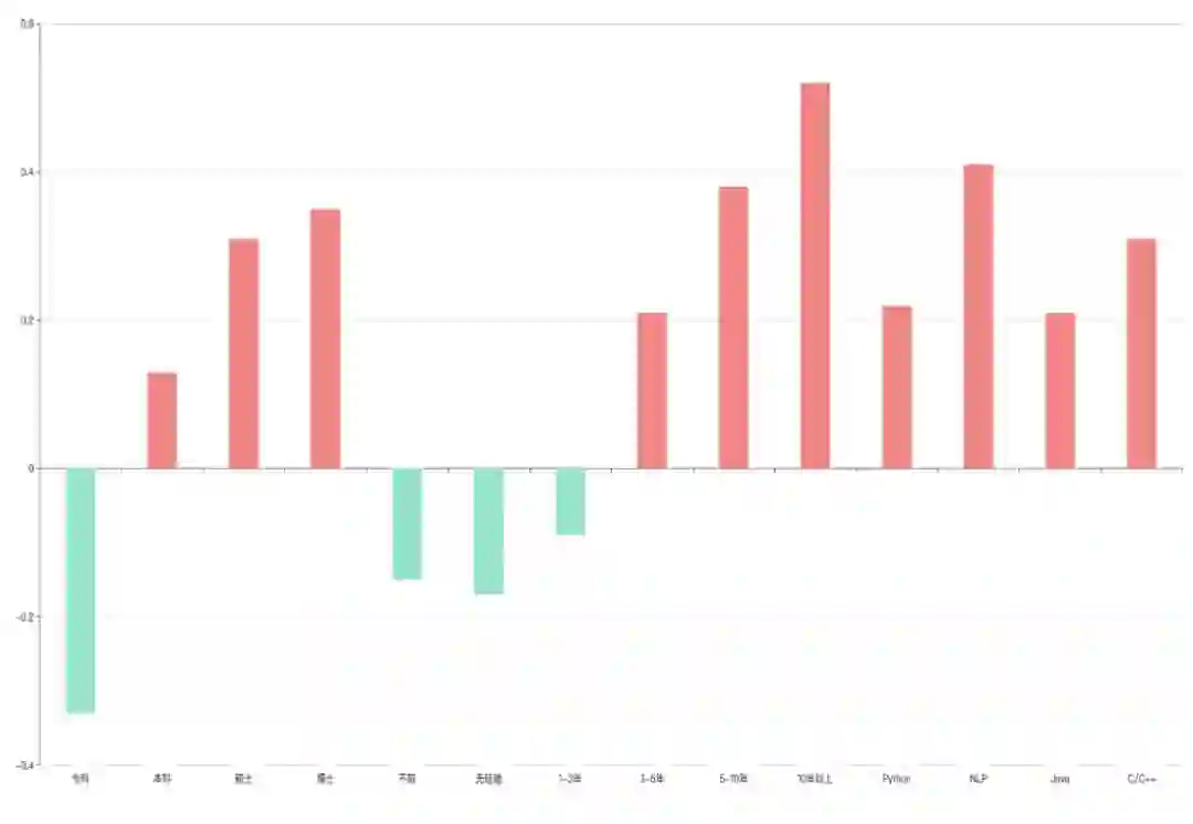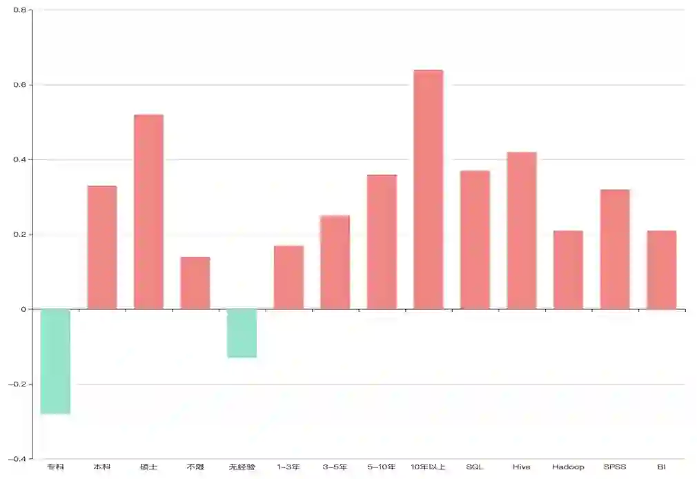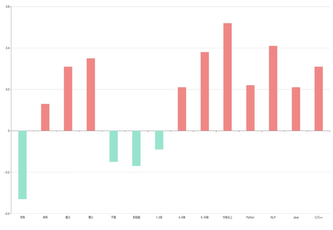 对比两个图可以发现,不论是数据分析师还是算法工程师都对工作经验有着较高的要求,其中算法工程师要有3-5年的工作经验才算能对薪资水平有一个“正向”的影响。其次数据分析师对SQL和Hive较高的要求而算法工程师要求的语言则是Python和C/C++,当然这只是个人因素对薪资水平的影响分析,公司层面的因素就留给感兴趣的读者去做。